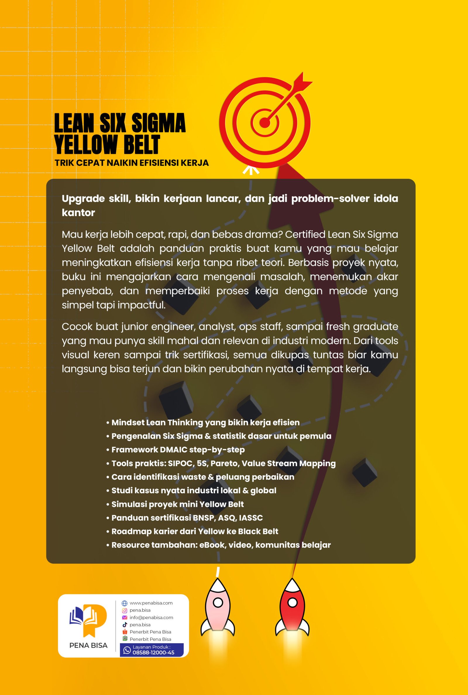 Efisiensi bukan lagi pilihan, tapi keharusan. Certified Lean Six Sigma Yellow Belt hadir sebagai panduan praktis untuk para profesional yang ingin menguasai pendekatan Lean dan Six Sigma sejak awal karier. Buku ini disusun secara sistematis mulai dari konsep dasar, hingga penerapan metode DMAIC dan peta proses yang bisa langsung digunakan untuk meningkatkan performa kerja.