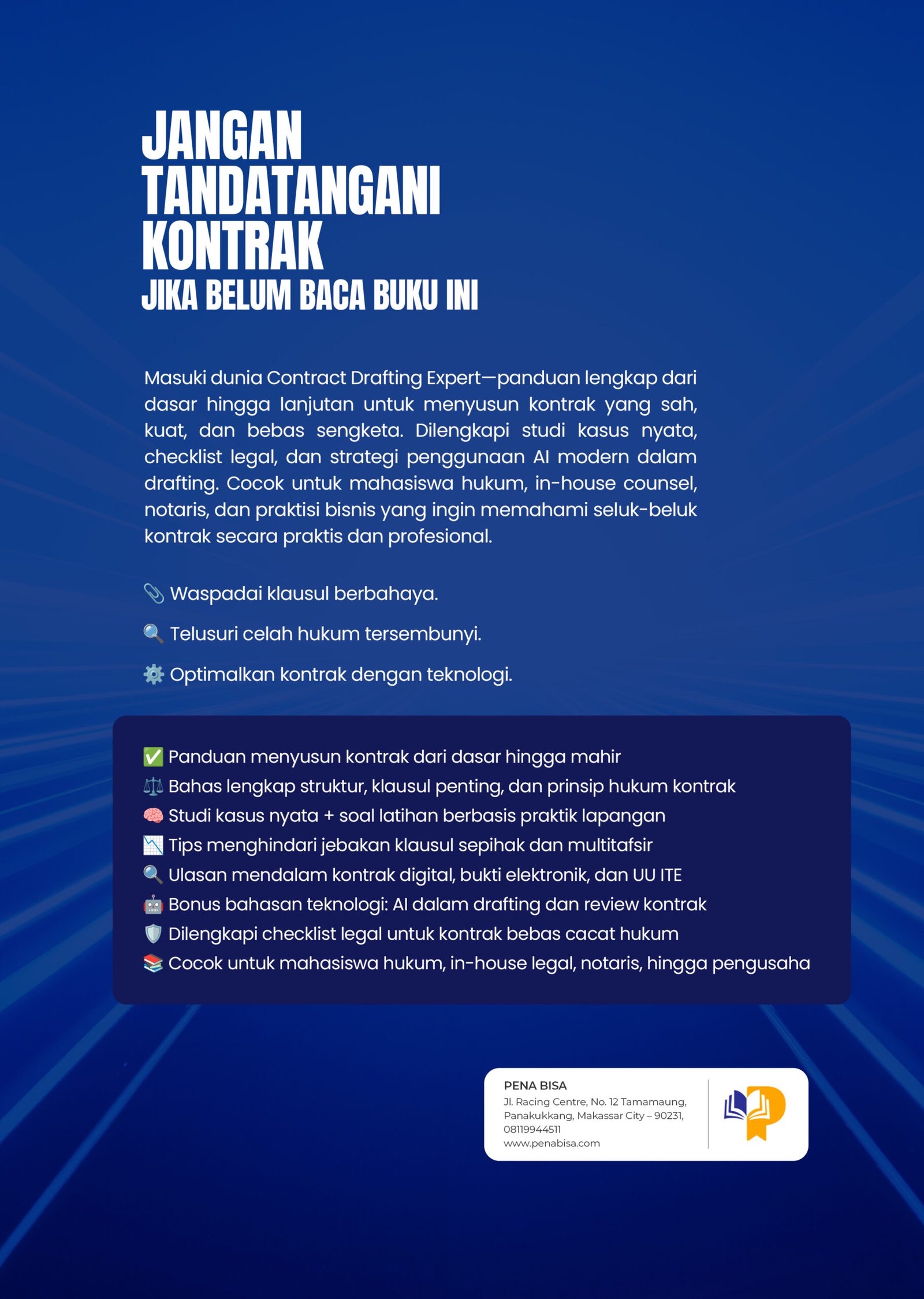 Setiap bab dilengkapi dengan studi kasus nyata, latihan drafting berbasis peristiwa aktual, dan audit kontrak untuk melatih ketelitian Anda sebagai penyusun.