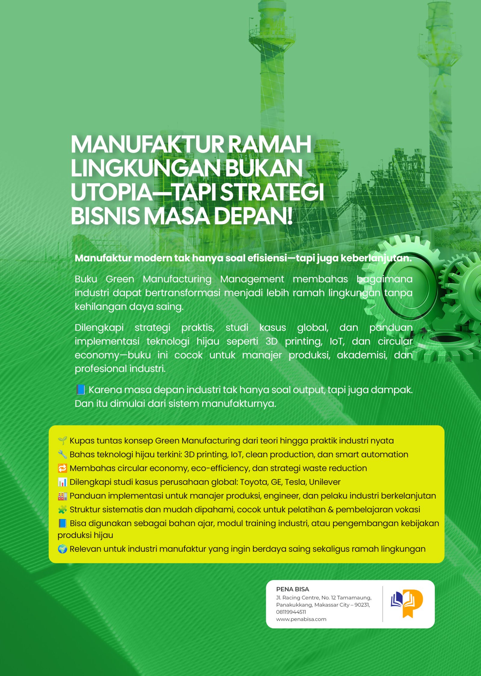 Jika Anda ingin perusahaan Anda tidak hanya bertahan tetapi juga unggul di pasar modern yang kompetitif dan sadar lingkungan, Green Manufacturing Management adalah sumber pengetahuan dan panduan implementasi yang tak tergantikan.
