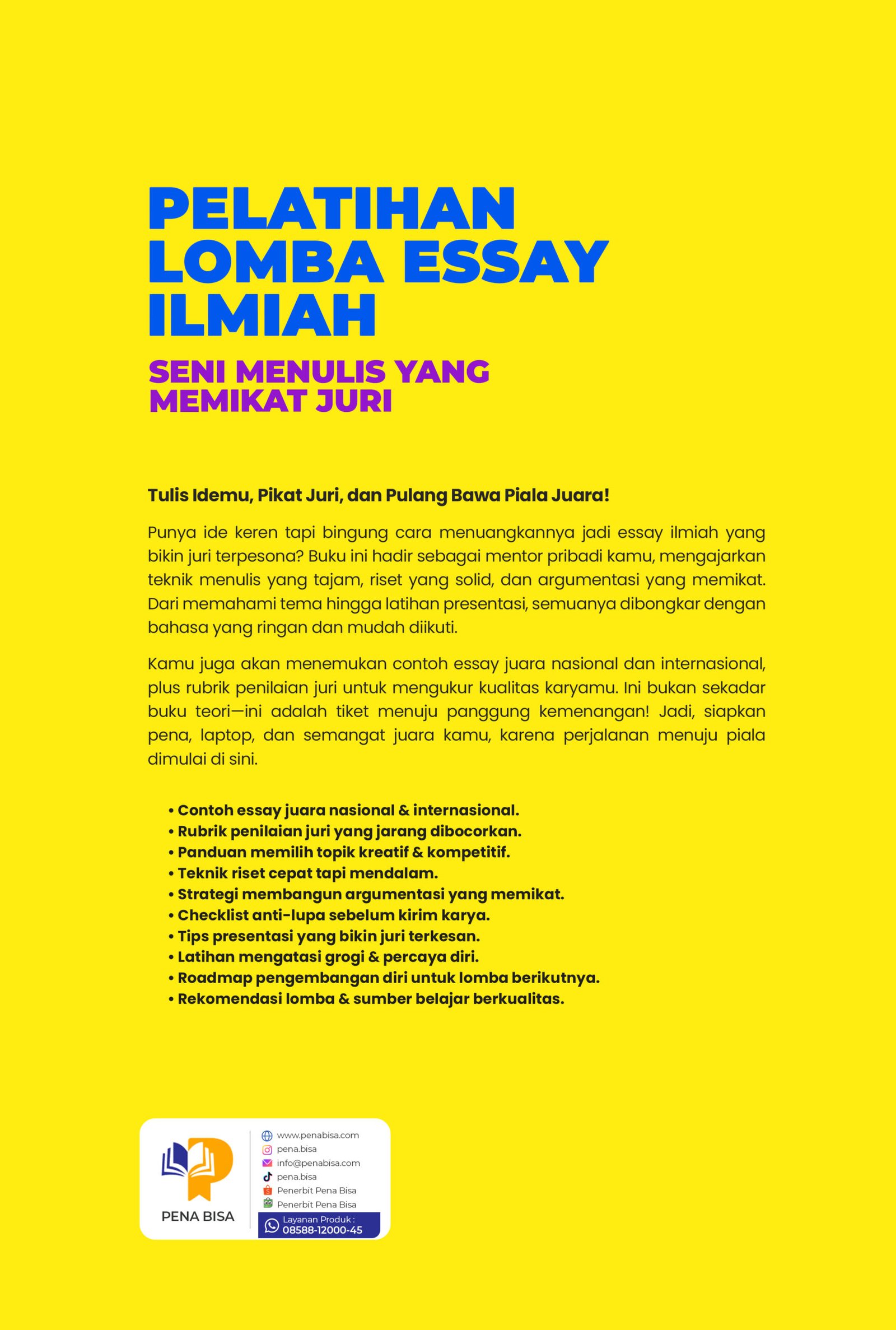 Menjadi juara lomba essay ilmiah bukan sekadar soal kemampuan menulis, tapi juga memahami struktur, logika argumentasi, dan ekspektasi dewan juri. Buku Pelatihan Lomba Essay Ilmiah adalah eBook yang disusun untuk membekali pelajar SMA, mahasiswa, dan komunitas akademik dalam menghadapi kompetisi essay tingkat nasional maupun internasional.
