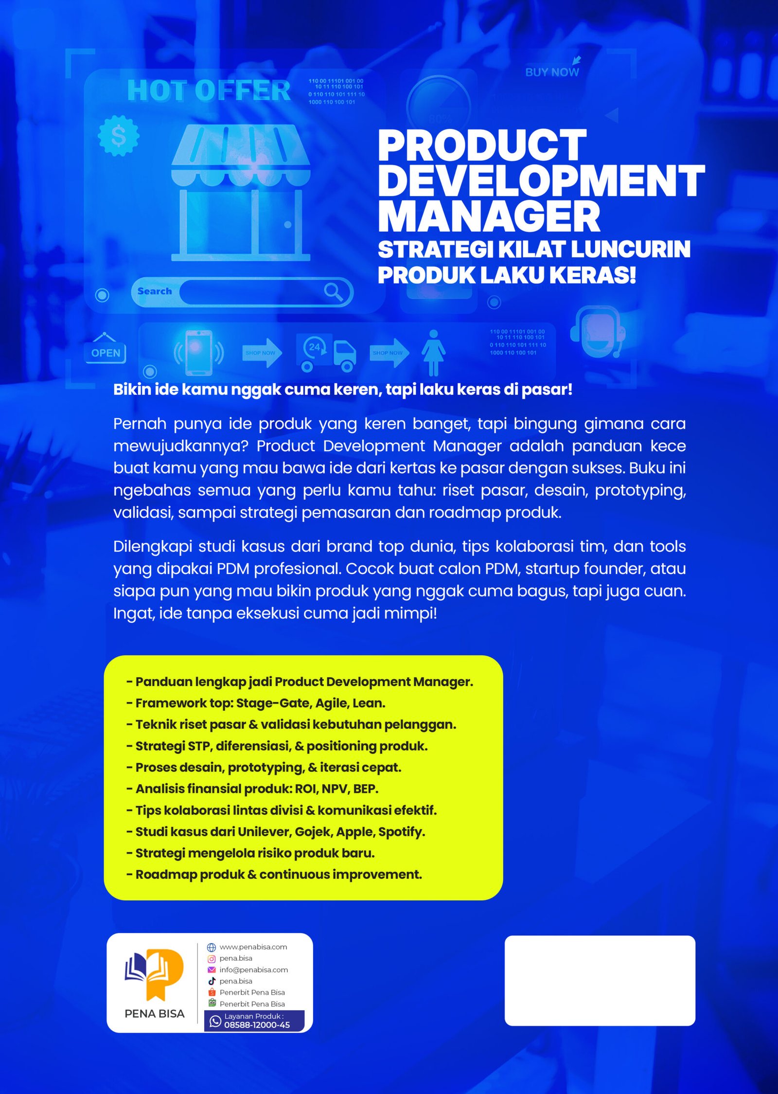 Ingin menguasai strategi pengembangan produk dari tahap ide hingga sukses di pasar? Buku Product Development Manager ini dirancang untuk membantu Anda memahami proses Research & Development (R&D) secara menyeluruh, baik untuk produk digital maupun fisik.