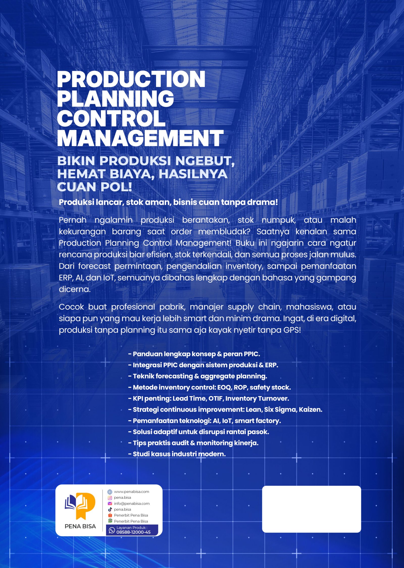 | Buku Production Planning Control Management adalah panduan lengkap bagi Anda yang ingin menguasai manajemen perencanaan dan pengendalian produksi (PPC) di industri modern. Dengan pembahasan yang jelas dan aplikatif, Anda akan mempelajari bagaimana mengatur jadwal produksi, melakukan peramalan kebutuhan (forecasting), serta menerapkan Material Requirement Planning (MRP) untuk meminimalkan biaya dan memaksimalkan efisiensi. |